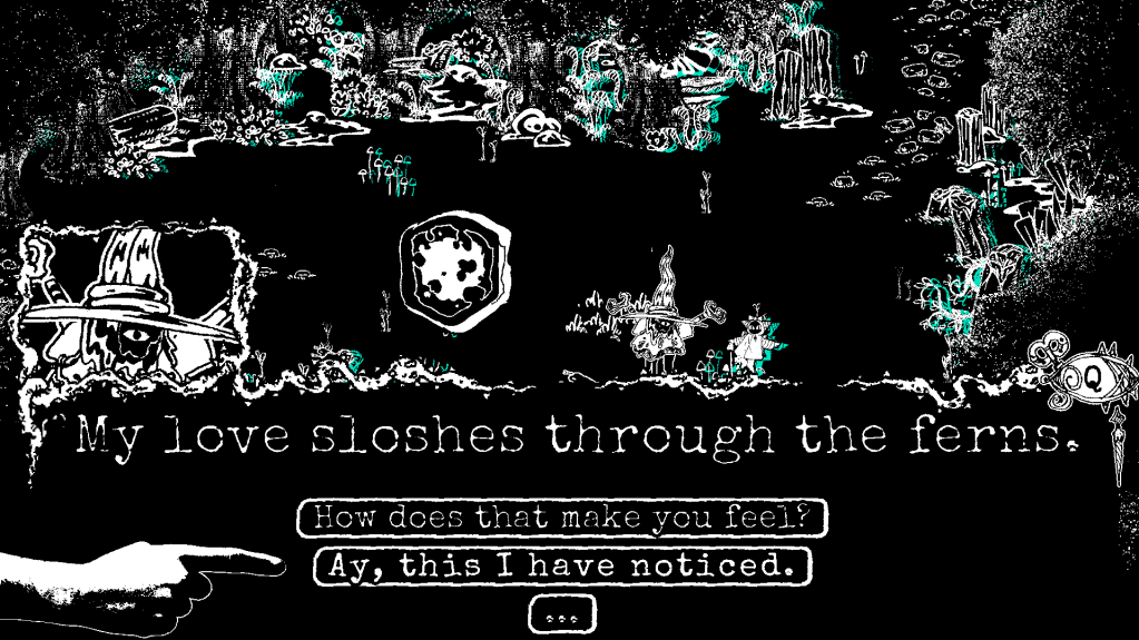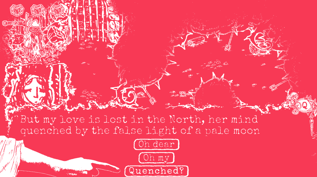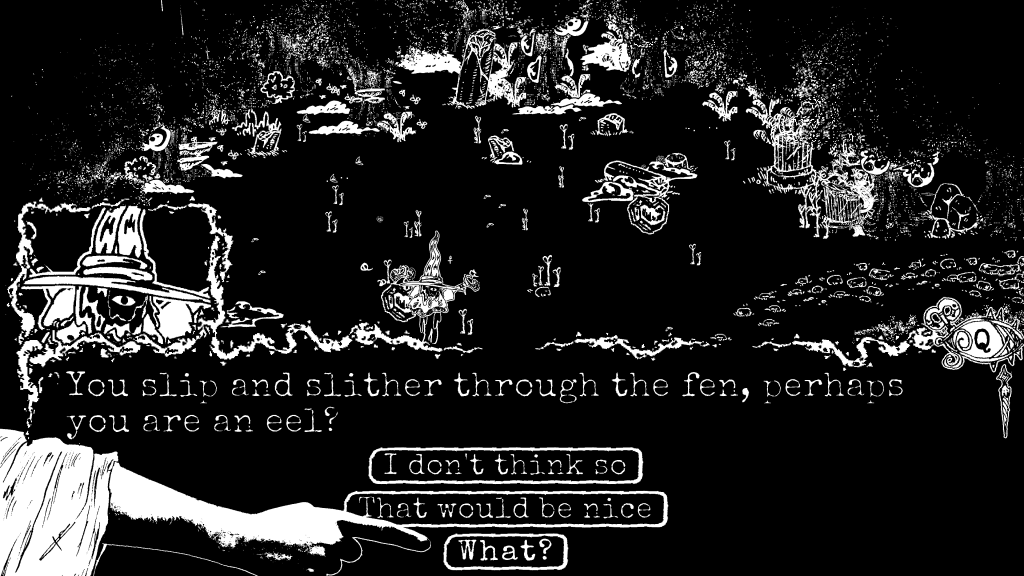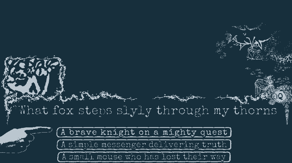 I’m drawing a lot of inspiration from folkloric storytelling practice in how much agency the character is given over the narrative (for more on this, see this other thing I wrote).